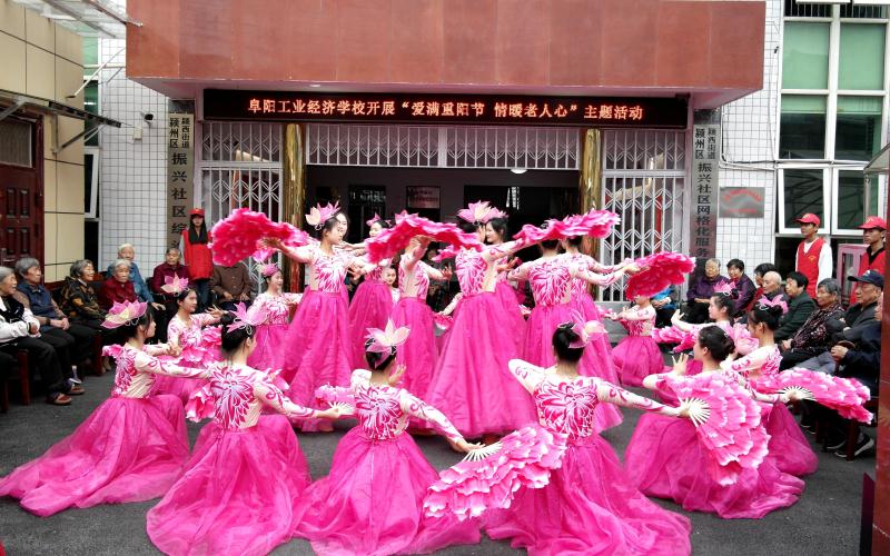 为大力弘扬中华优秀传统文化,培育和践行社会主义核心价值观,传承中华民族尊老、敬老的传统美德,10月14日下午,阜阳工业经济学校赴颍州区振兴社区开展“我们的节日·重阳”传承敬老美德主题活动。校党办主任李伟和志愿者、学生演出人员一行30余人参加活动。