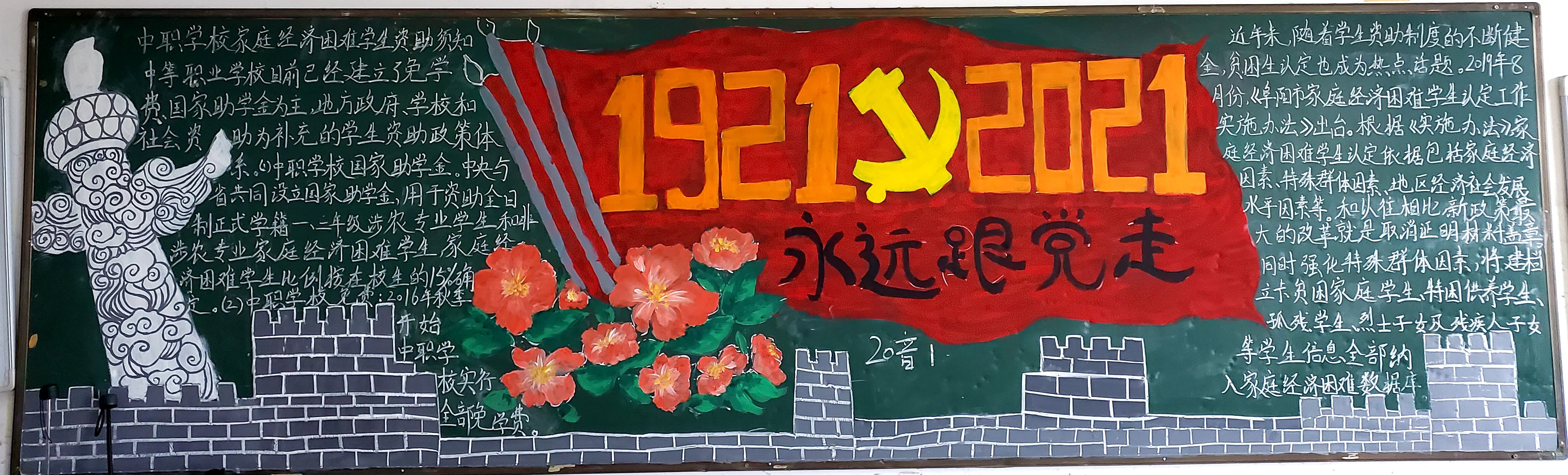 校团委组织专人对各班黑板报予以量化评比,评选出一批优秀黑板报。这些黑板报主题鲜明,材料突出,设计精美,用颜料和粉笔描绘出新时代中职生对党的热爱,增添了广大学子实现远大理想的力量,向中国共产党建党100周年献出一份特别的贺礼。