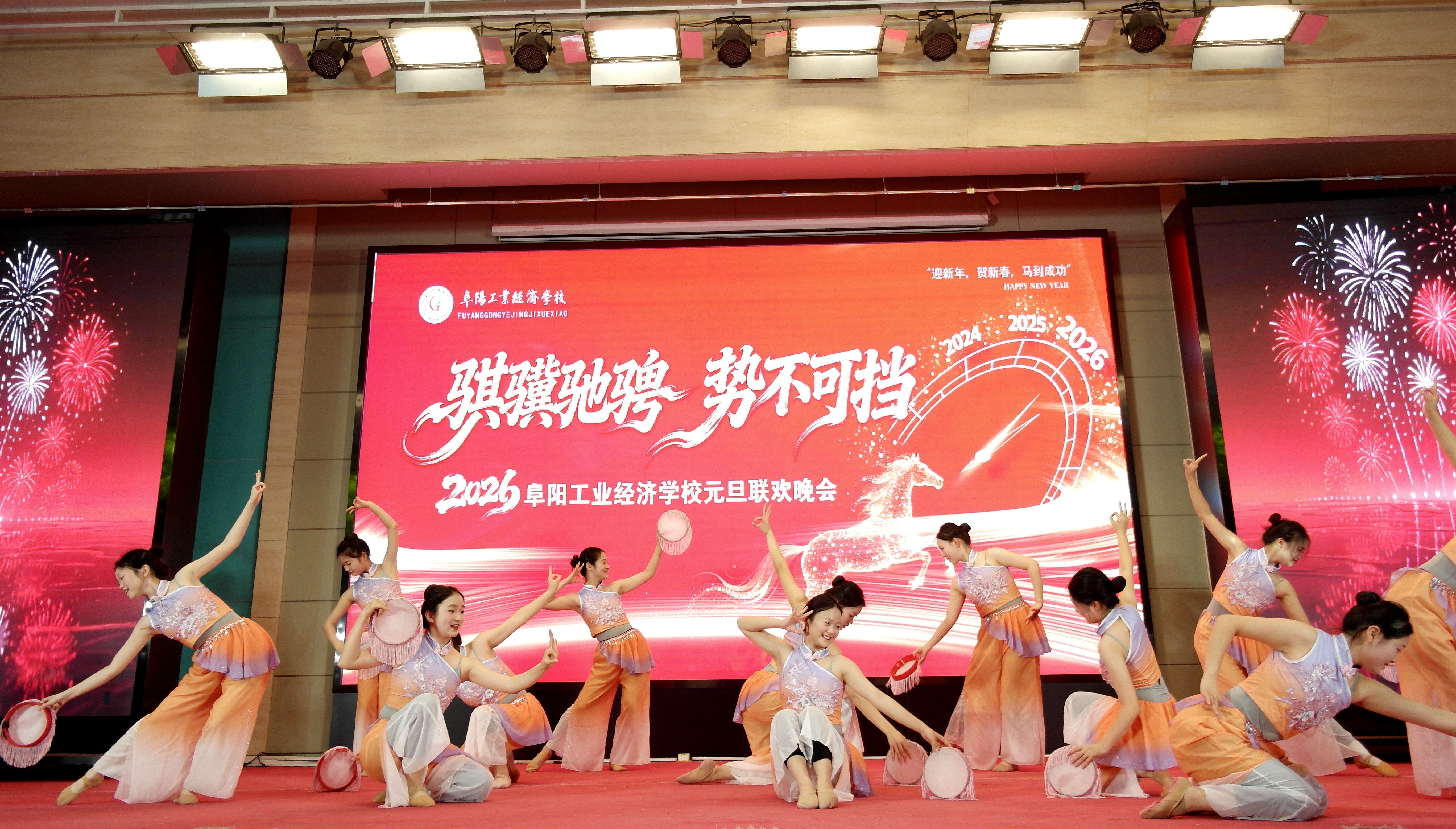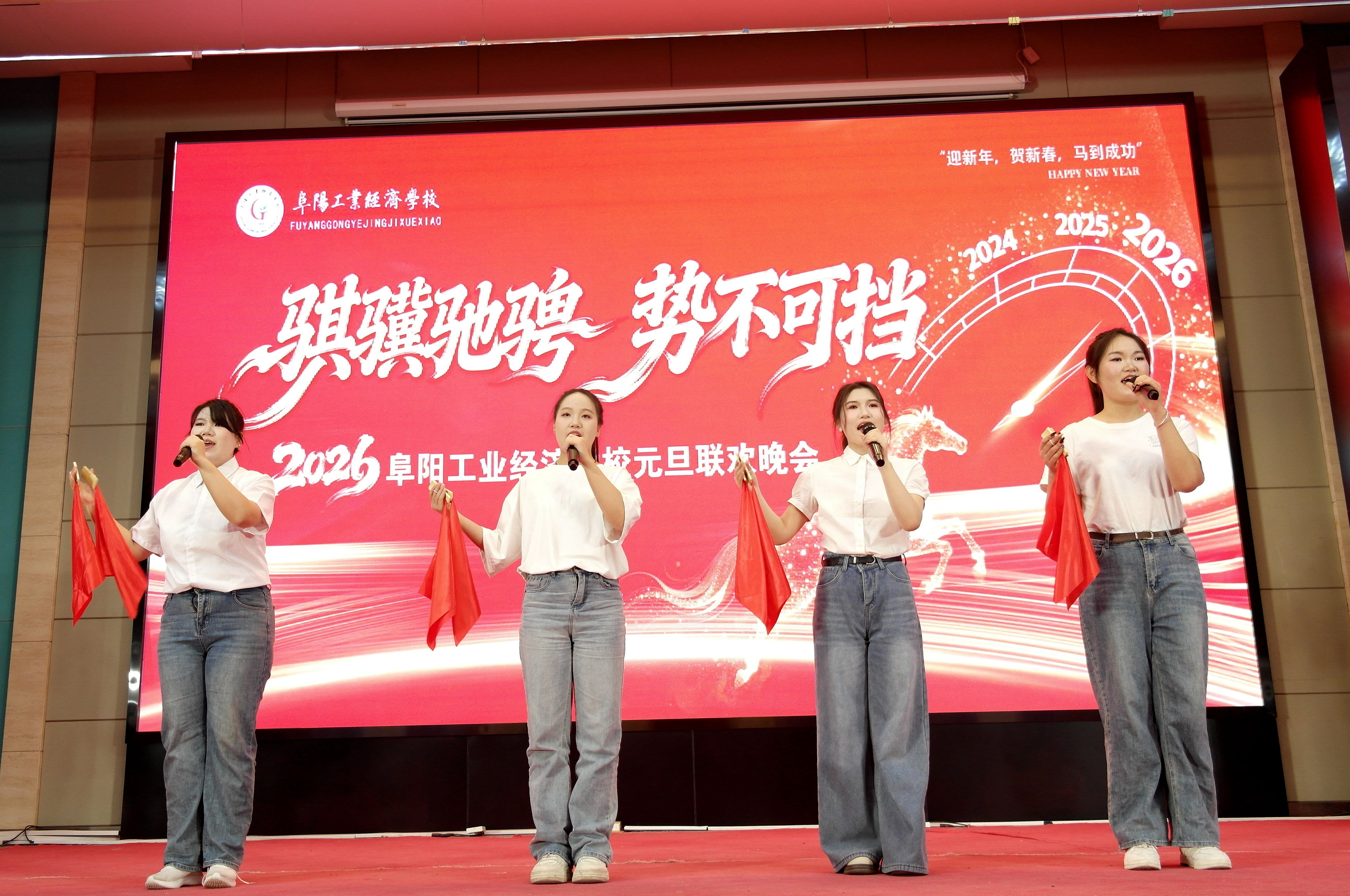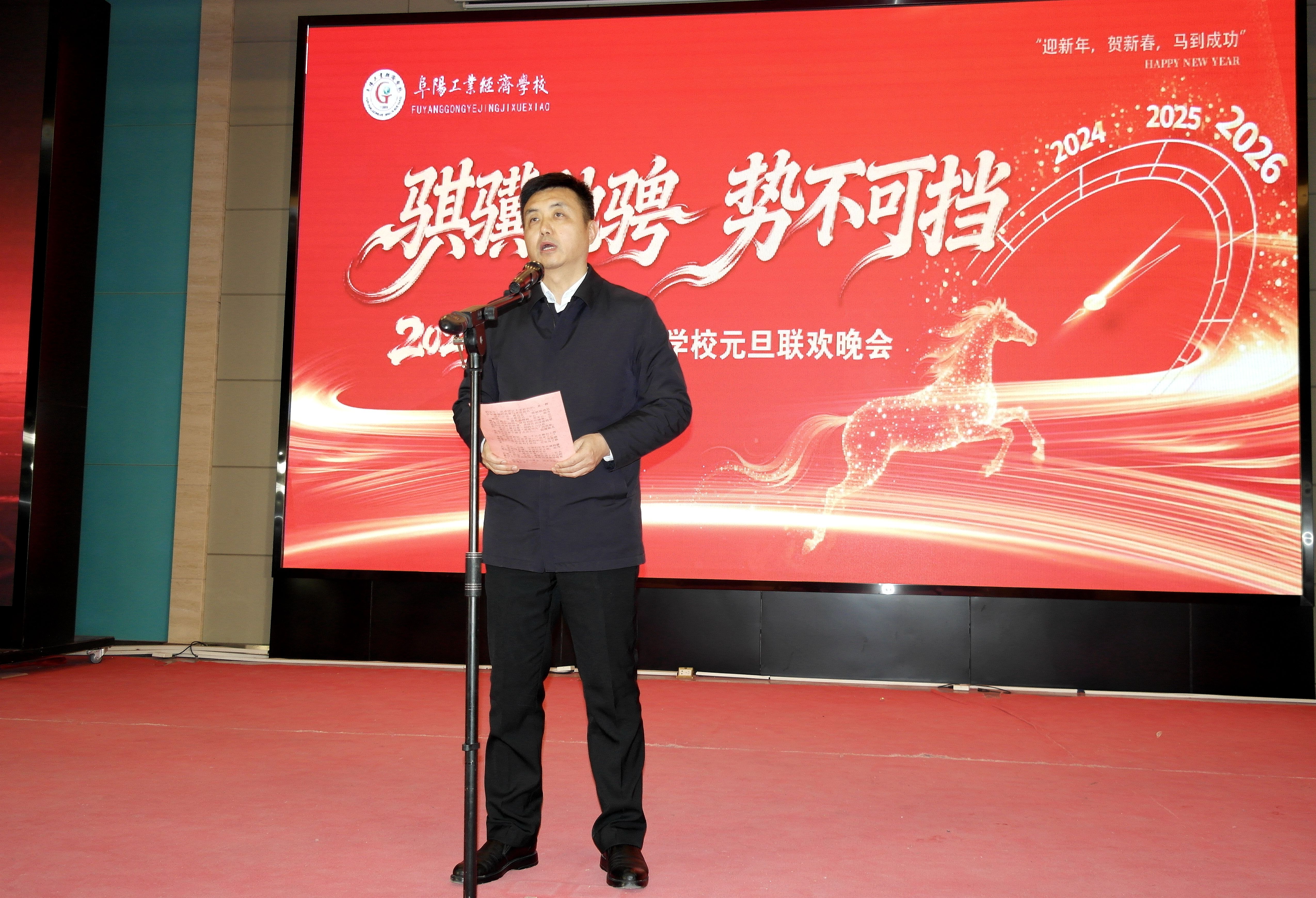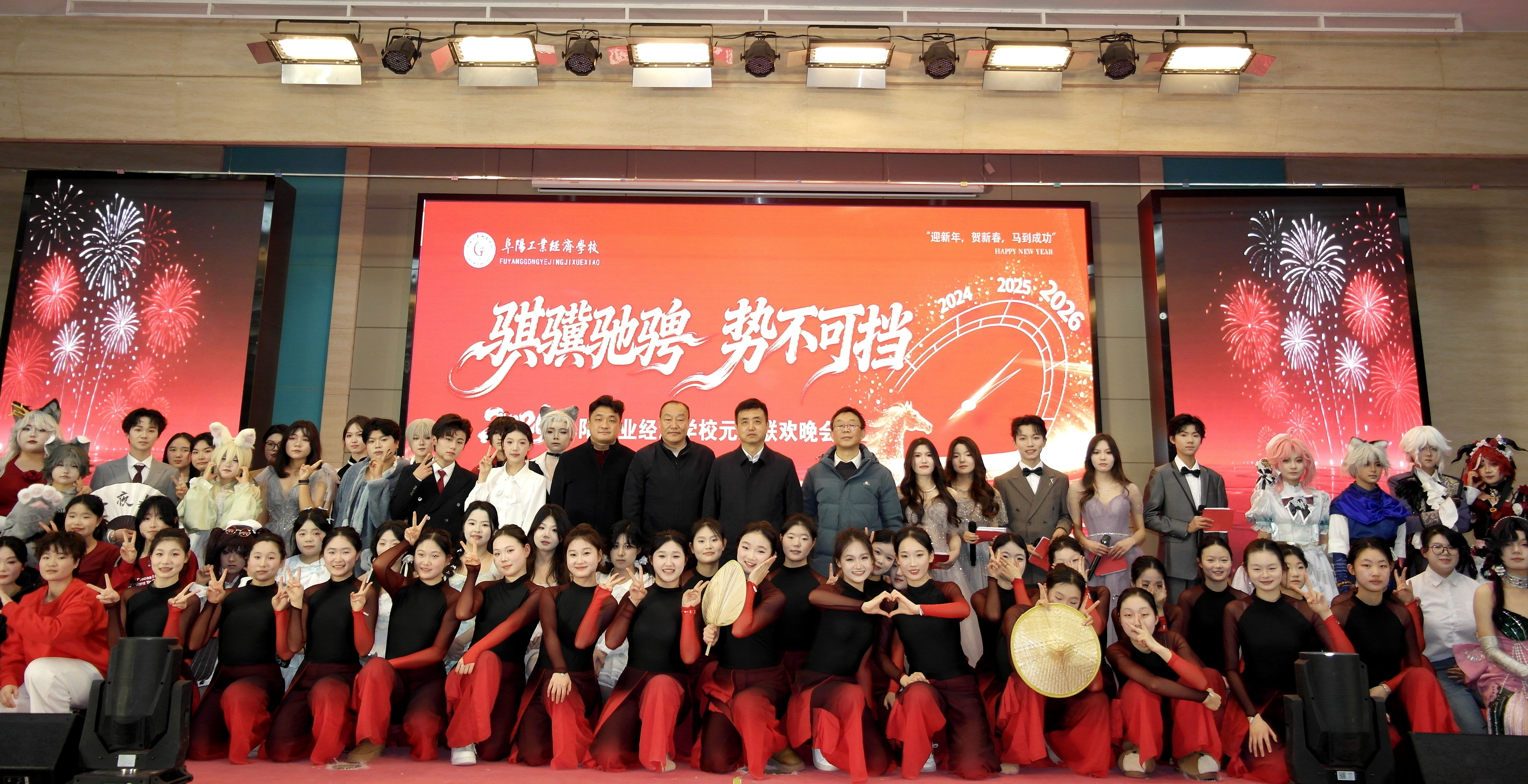 岁序更替,华章日新。12月30日晚,阜阳工业经济学校南校区多功能报告厅灯火璀璨、欢声如潮,以“骐骥驰骋 势不可挡”为主题的2026年元旦晚会隆重上演。校领导、师生代表齐聚一堂,在歌舞翩跹中挥别耕耘的2025,于欢声笑语里迎接充满希望的2026,共同定格这场融青春活力、匠心底蕴与家国情怀于一体的视听盛宴。​