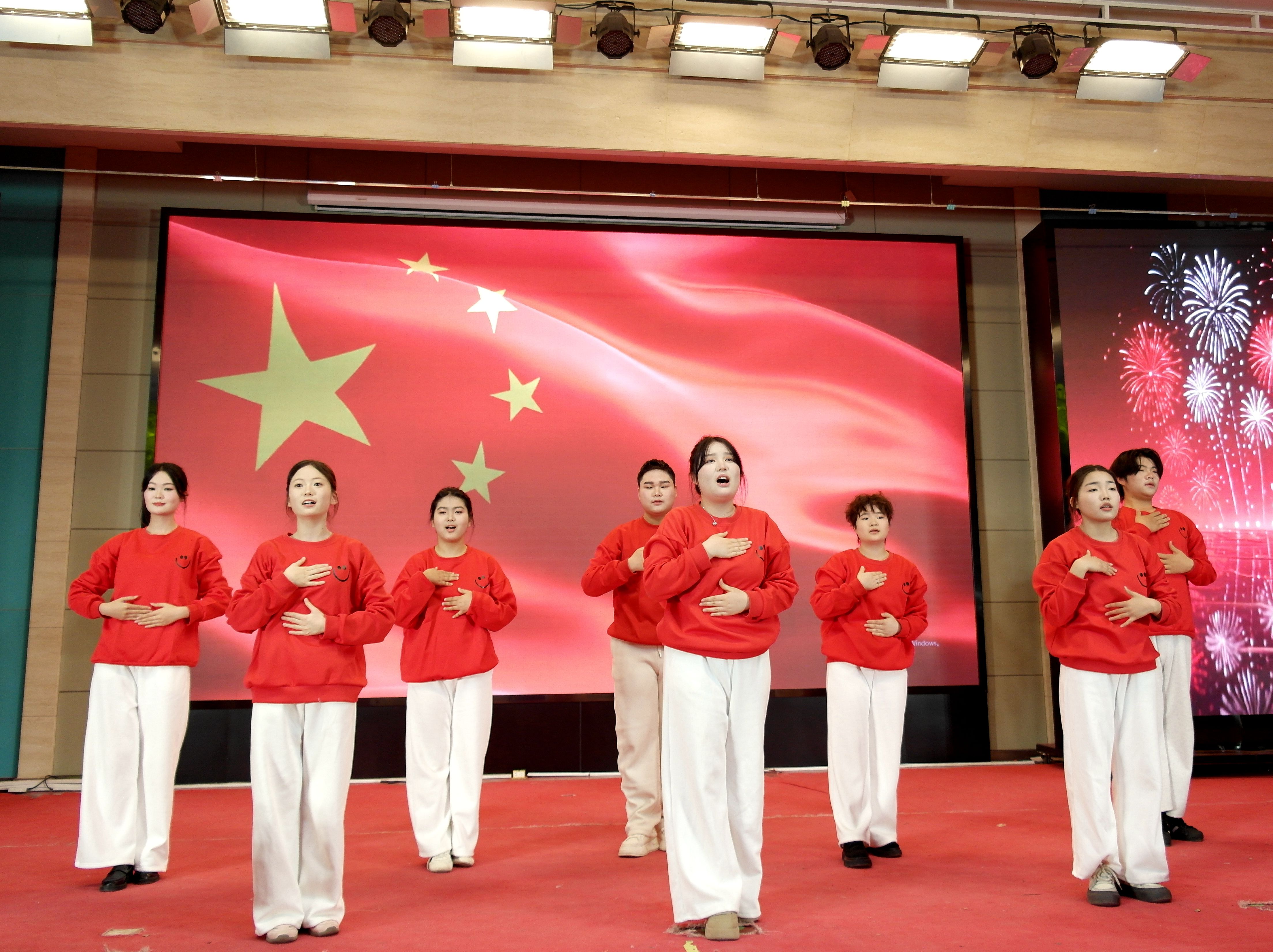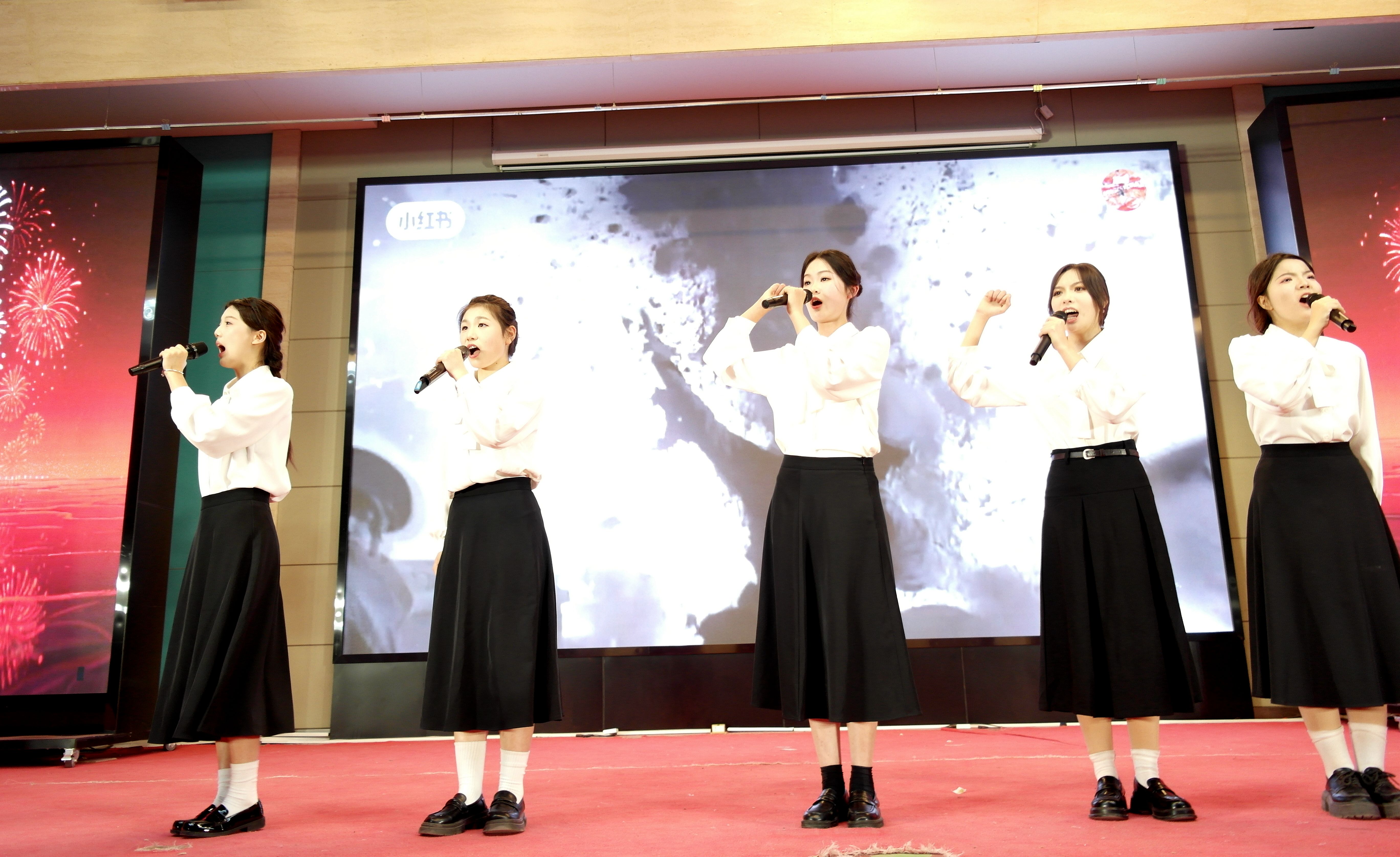 歌伴舞《花开新时代》喜庆昂扬,师生联袂演绎,激昂奋进的旋律中,学子们身着绚丽华服,随节奏变换灵动队形,舞姿舒展大气;演唱者歌声嘹亮、饱含深情,刚柔并济的演绎将新时代的昂扬朝气与奋进姿态展现得淋漓尽致,为晚会增添了浓厚的喜庆氛围。