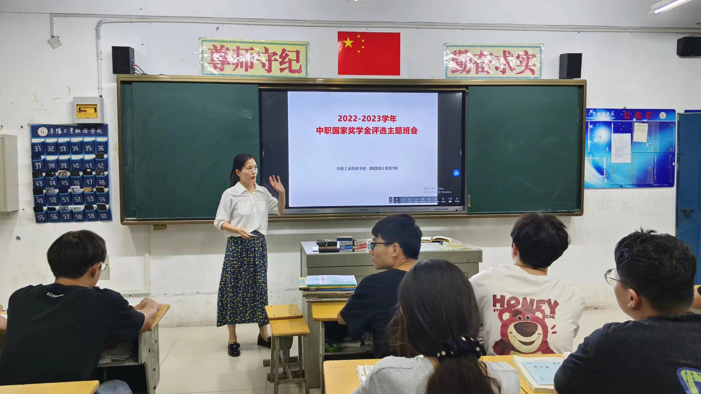 阜阳工业经济学校各班级按校资助办要求利用晚自习时间召开2023年中职国家奖学金评选主题班会。班主任带领学生学习了国家奖学金的申请条件、评选标准、评审制度、申报流程及填表注意事项。并鼓励符合条件的学生踊跃报名,尽快办理奖学金相关事宜。
