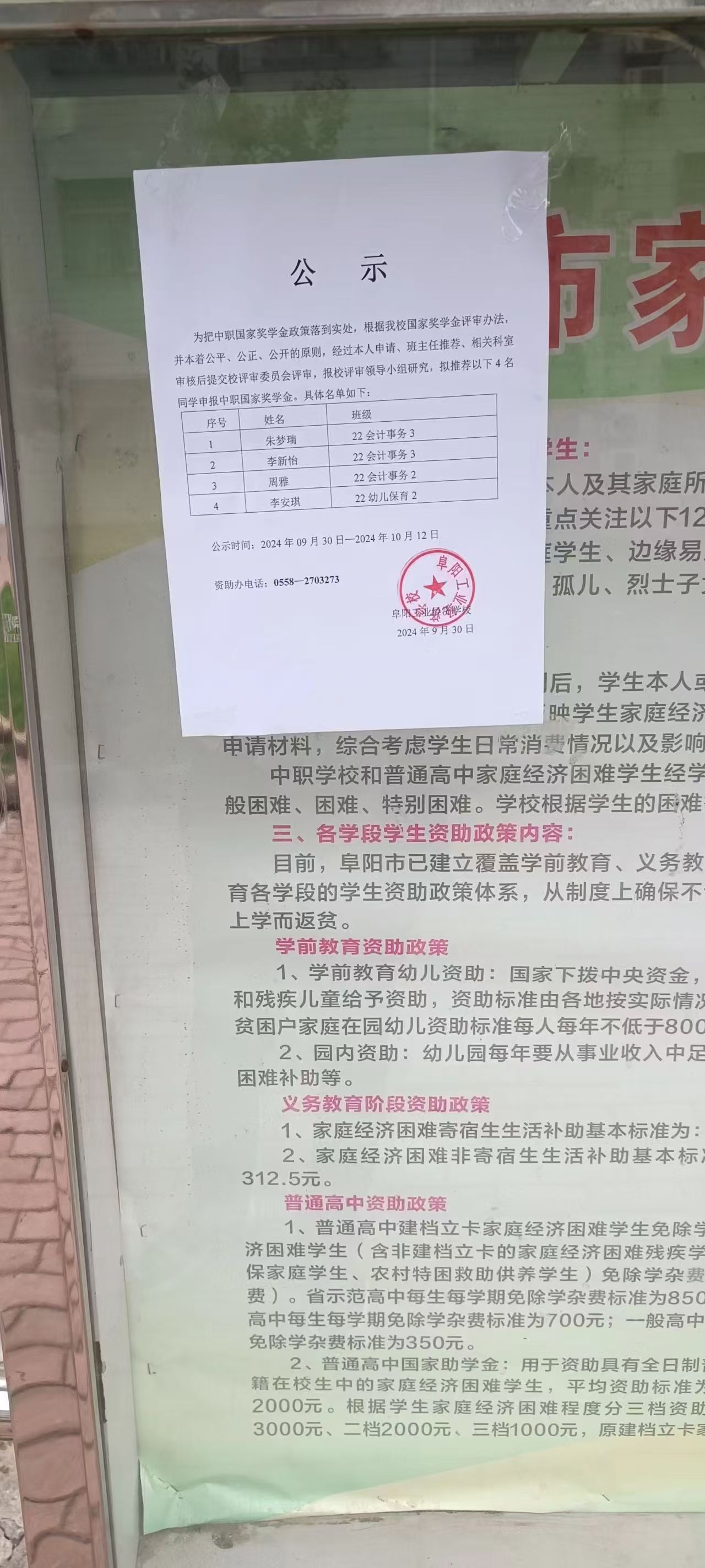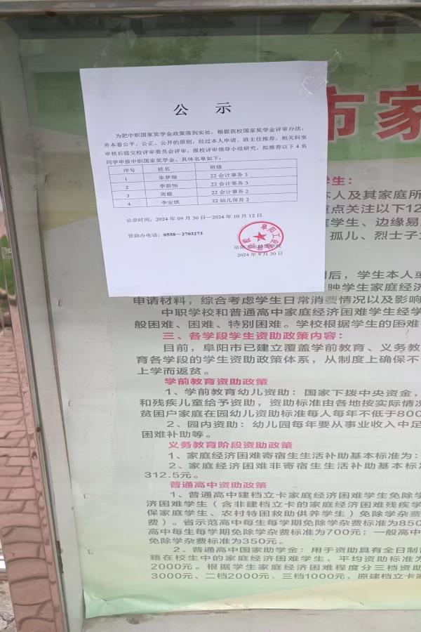 阜阳工业经济学校2024年国家奖学金公示