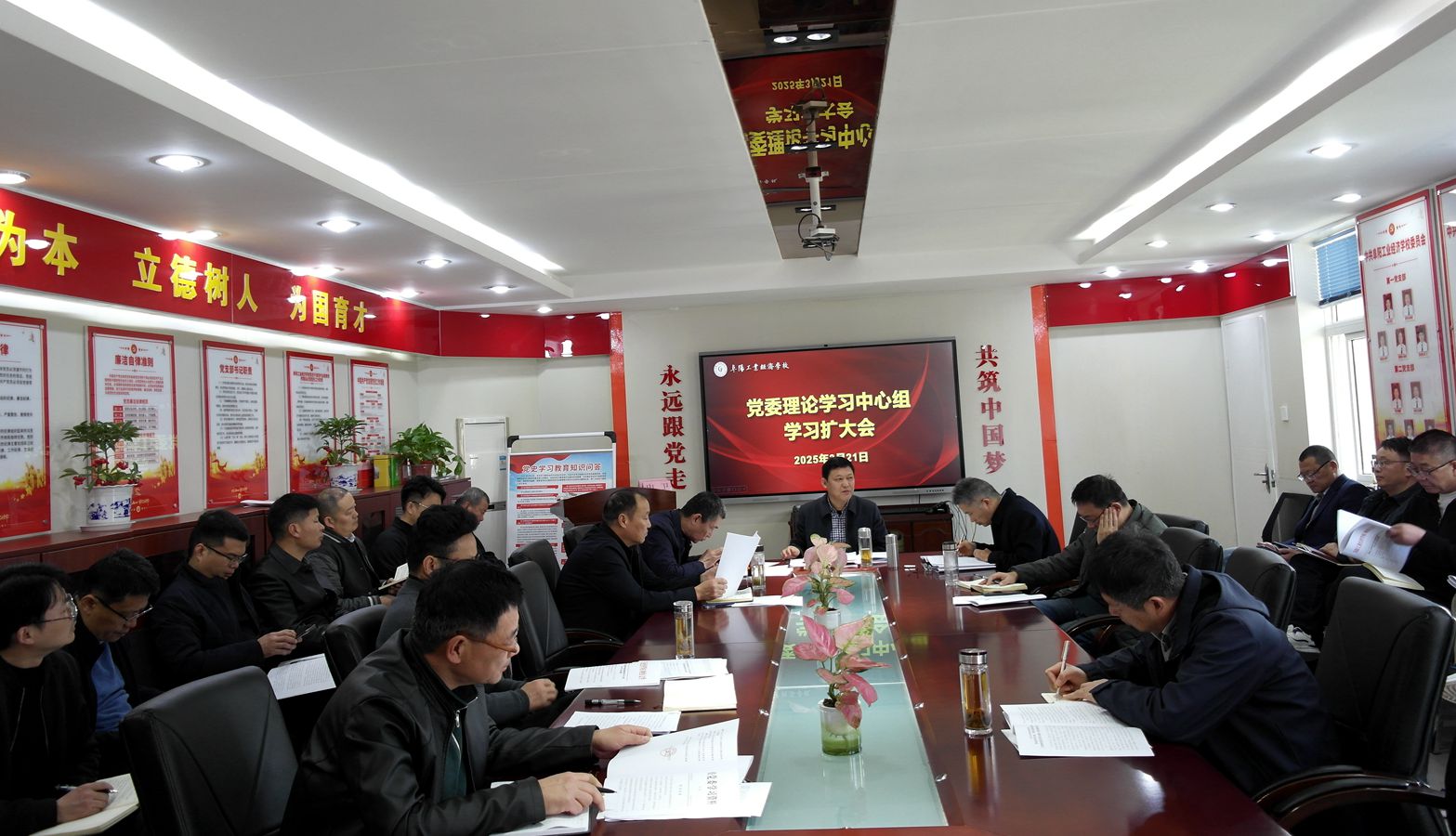 3月21日,阜阳工业经济学校召开党委理论学习中心组学习扩大会,校党委书记周波主持会议并讲话,校班子成员、各科处室负责人参加会议。