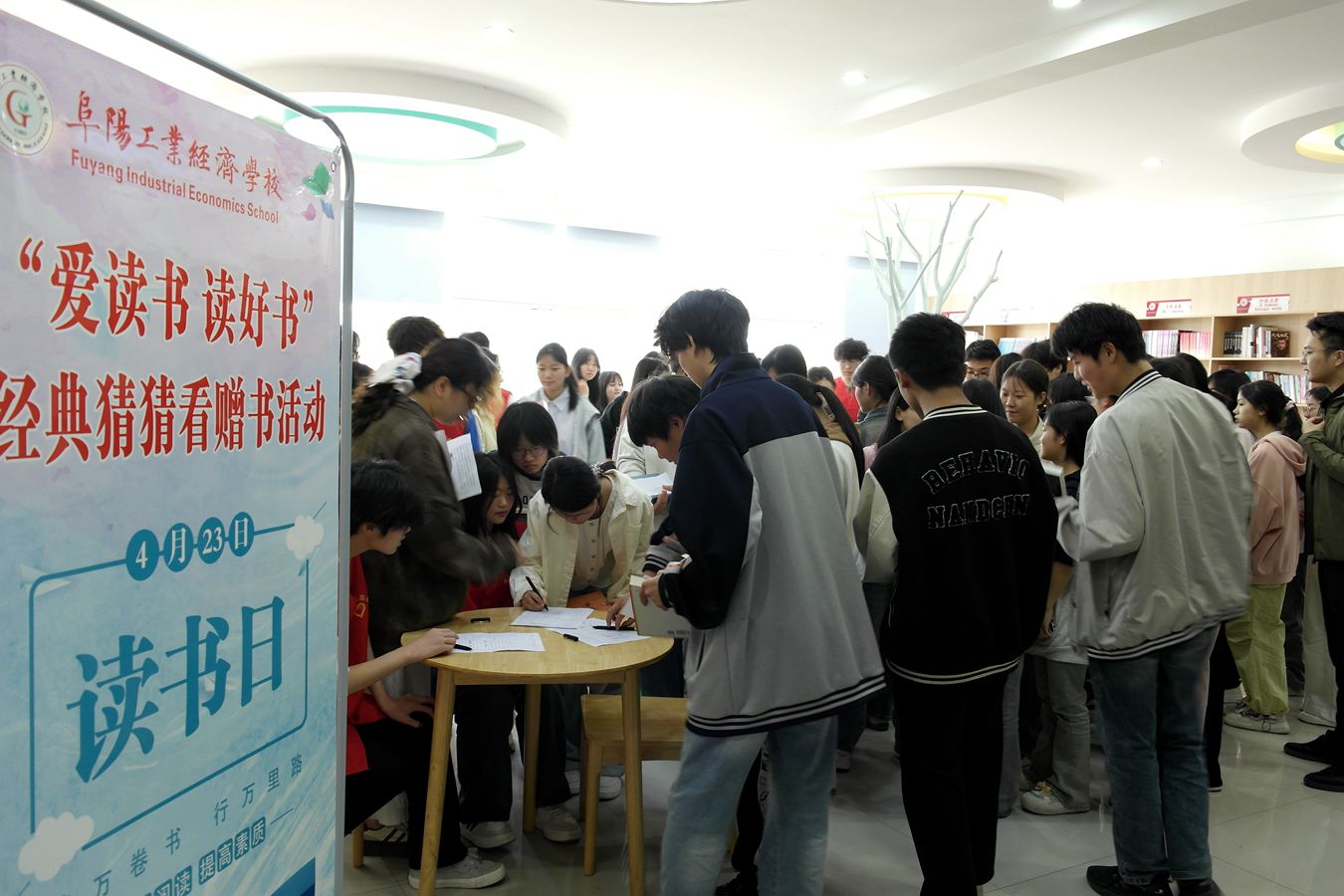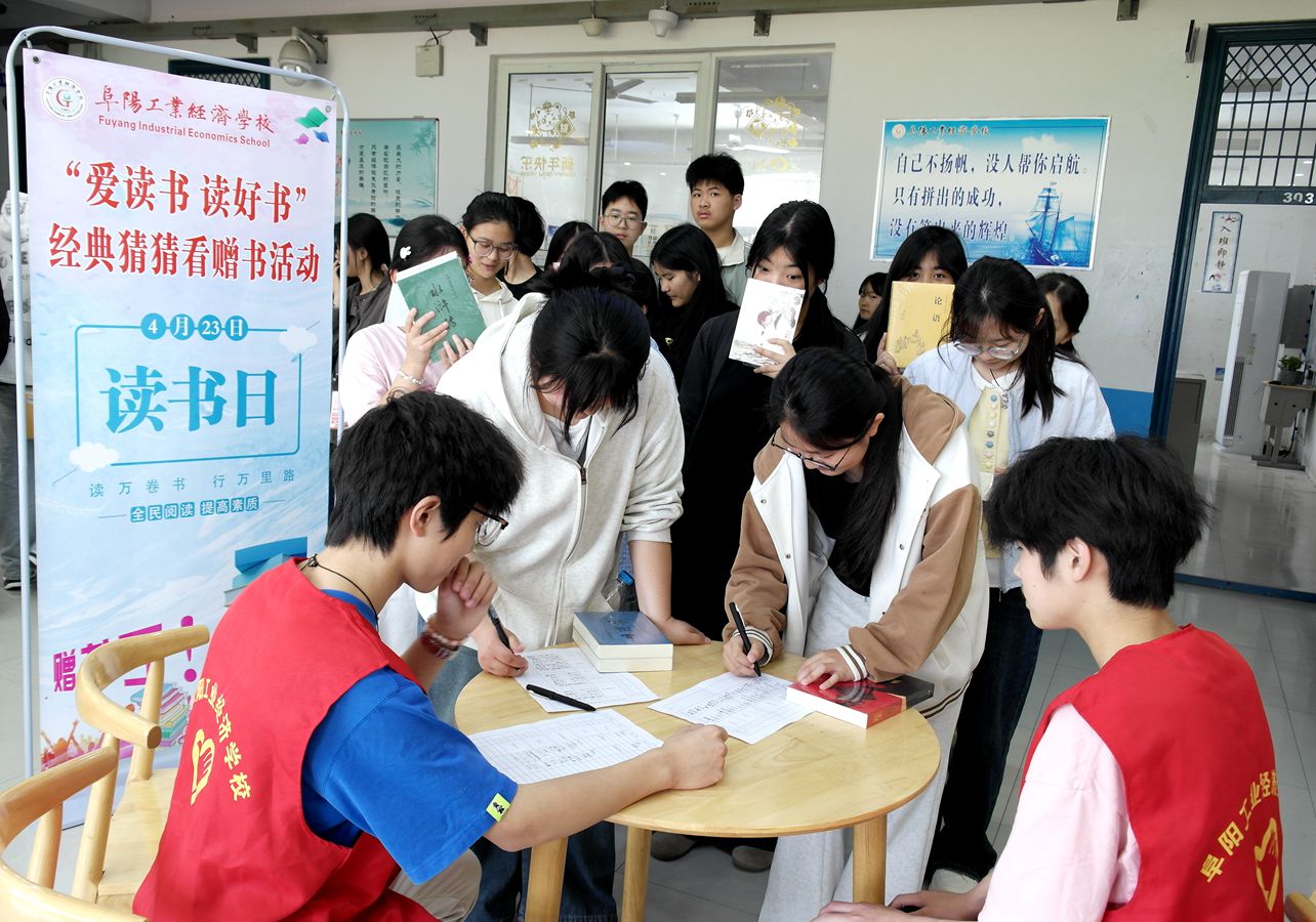 书香润校园,经典沁人心。为营造浓厚的阅读氛围,引导学生亲近经典、热爱阅读,4月23日世界读书日当天,阜阳工业经济学校团委精心策划的“爱读书 读好书”经典猜猜看赠书活动在两校区图书角火热开展。本次活动以趣味互动为载体,将经典阅读与与益智游戏相结合,吸引了同学们的热情参与,让春日校园洋溢着浓郁的书香气息。