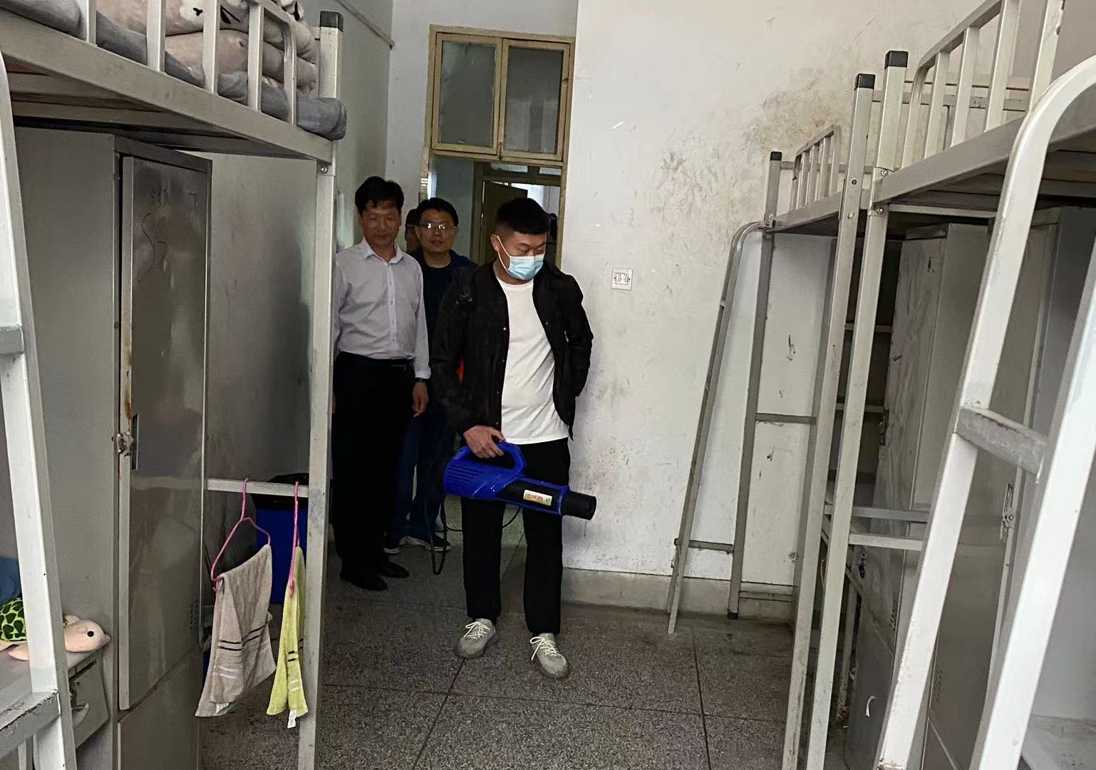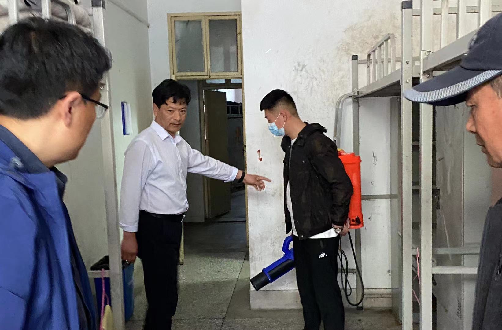 2021年5月11号下午,副校长凌新带领总务科相关同志进行消杀工作督察。凌校长具体查验了药液的配比,监视了寝室和卫生间的消杀过程和记录过程,随行的总务科张浩科长随机采访了几位同学,他们表示消杀效果较好,在感冒、水痘等疾病的流行期间,同学们染病率较低,最后凌新副校长要求要进一步加强对合作方蓝天救援公司的监督和指导,确保取得最佳的消杀效果。